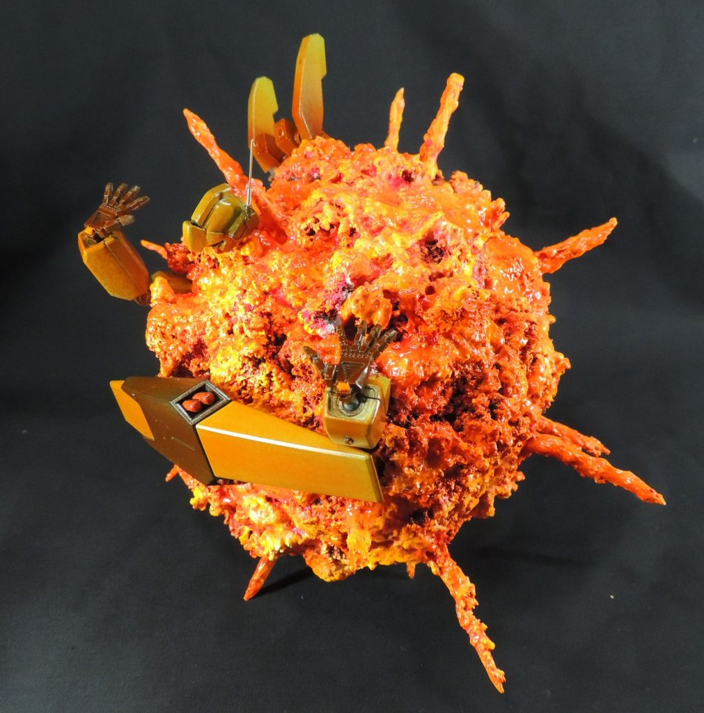 "摩擦熱とオーバーロードで自爆"したジェガンは、発泡スチロール球に透明ランナーを多数刺し、鉄道模型メーカーのターフをジェッソやマットメディウムで固着して形を作りました。塗装はアクリルガッシュの赤や黄色を筆塗りした後、ラッカーのクリアオレンジを吹き付けています。