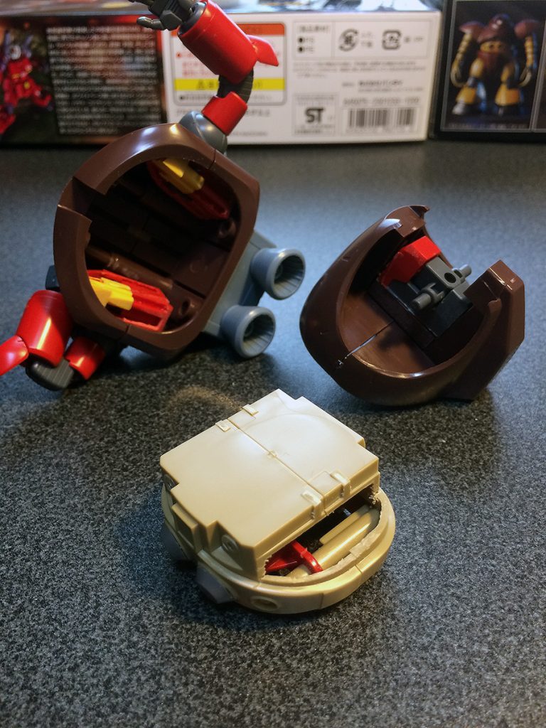 ガンキャノンの胸を縦に分割し、ゴッグの左右に配置。干渉する腹パーツを削っています。