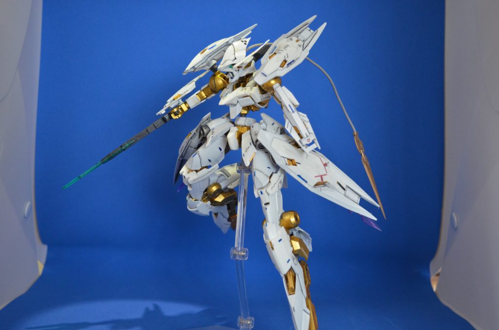 HGレギンレイズジュリアの色をホワイト/ゴールドに変え、脚部を中心に改修。変形ギミックをオミットし、そのままの長さで製作。着地できないので、ランディングギアタイプの接地部をコトブキヤさんのラジエータパーツで作成しています。頭部のふくらみ部分はジャンクパーツから。そこから延びる有線ブレードはGNブレイドを流用しています。
