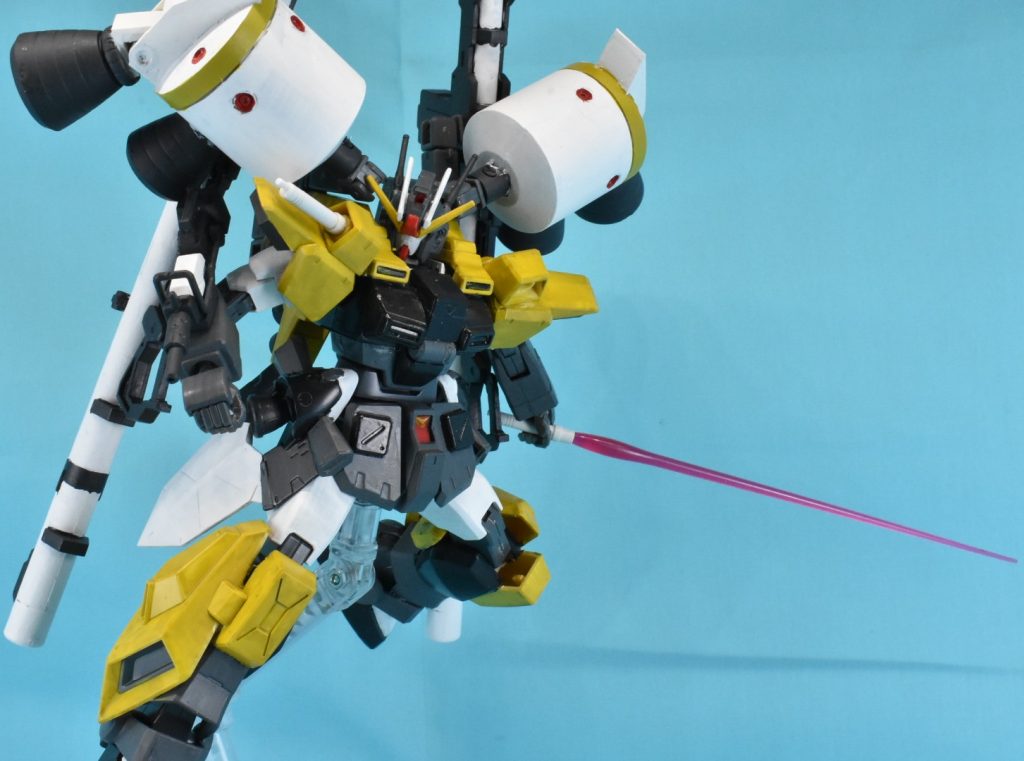 右腕に陸ガン付属の100mmマシンガンと180mmキャノンを組み合わせたマシンガンを装着。マガジンの着脱機能は残してます。背部のバズーカは他社キットの物を流用しています。カーディガンのアームと繋げているので、ある程度までなら可動出来ます。