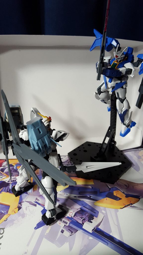 無塗装時に腰回りにあった紺色のパーツは通常のダブルオーの腰パーツを前後を逆にすることで自然にはまりますが、少しS字立ちのようにもなっています。