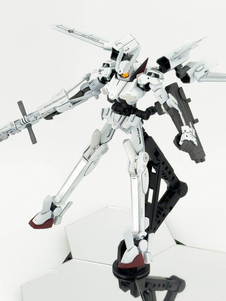 腰に配されていた小さいほうのウイングユニットをバックパックへ集約し、バックパックとウイングの基部にジョイントを追加することでユニットそのものをより柔軟に動かせるように改造しました。ウイングをX字に展開できるようになりました。また、その分空いた腰にはレールキャノンを装備。オリジンザクハーフキャノンから持ってきています。