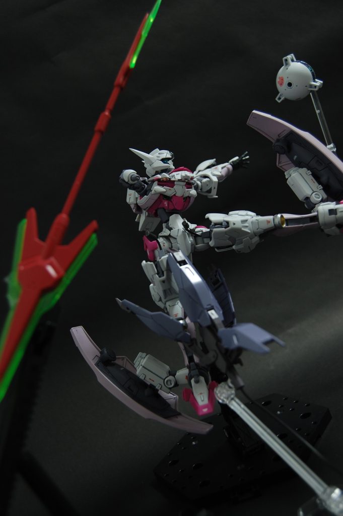 後継機・改修機の強化イメージとして考えられる「武器が増える・大型化する」「シルエットが上向きになる・尖る」といったものの逆をいくようなデザインを意識しました。武装はガンビットのみです。球状シェルユニットの発光部は釣り用ホロシールにガイア蛍光ブルー→水性ホビークリア→アクリジョンブラックでクラック模様をつくり上からUVレジンでコートしました。
