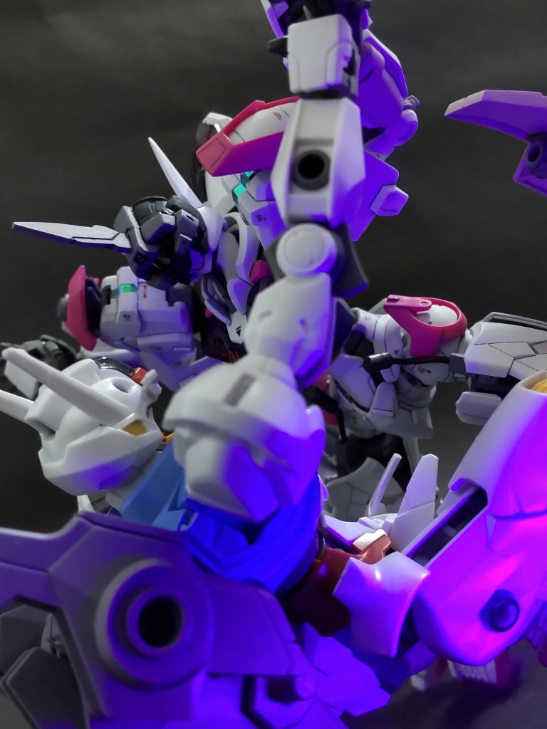 メインカラーは当初灰色か紫系を考えていたのですが、悪役を連想させる要素や記号を必要以上に入れなくてもいいのかなと作っていくうちに思えてきました。ルブリスのピンクは闘う変身ヒロインのような可憐な色で、これをエルノラのパーソナルカラーと捉えてこれに反しないような色を入れました。もともと二つのドレスが抱き合ってるようなドレスの写真をみて、エアリアルとルブリスの前後アシメ合体を考えていたので背中にその名残があります。使用塗料は水性ホビーの水星の魔女用各種、レイ専用機パープル、マスク部はミスターカラーのネイビーブルー、バーニアがGXブルーゴールドとシャインシルバーにガイアの蛍光ブルーを使いました。