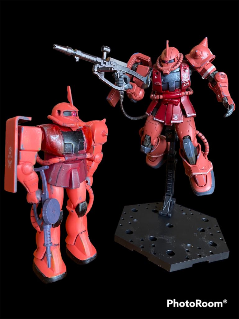 オリジン買ってすぐに作った旧キットのシャア専用ザクと。進歩の違いが凄い。