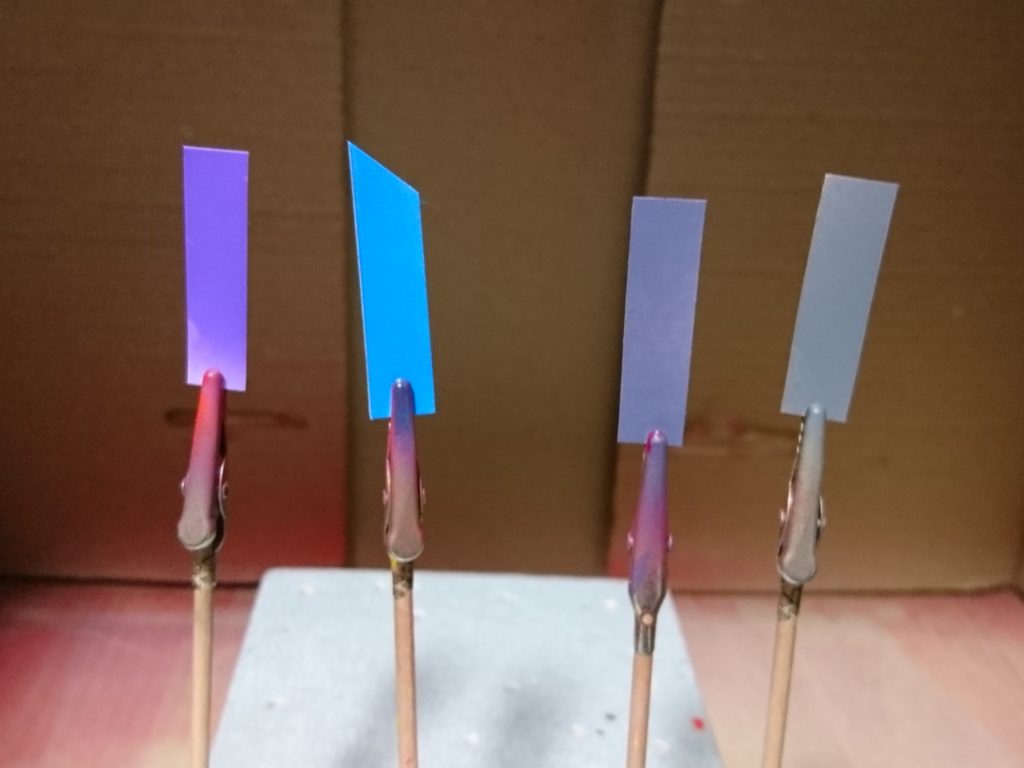 上がコーティング前、下がコーティング後。左からパープル、ライトブルー、メカグレー、グレー。