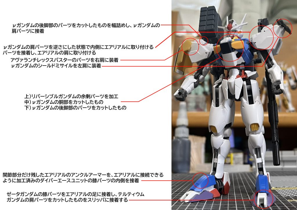 ガンダム・エアリアルをベースに改造されたガンプラ。ヘヴィウエポンコマンドガンダムを参考に追加装甲による高い防御力と重火器による制圧戦を重点に置いている。また、武装の全弾切れを前提に機動力による近接戦闘にも対応しており、使い切った武装・サブアームをパージする事で機動力が増加し、更にはGUNDフォーマットの恩恵により機体性能を飛躍的に向上させる事でより高い機動力を持ち、遠近にも対応できる汎用機でもある。