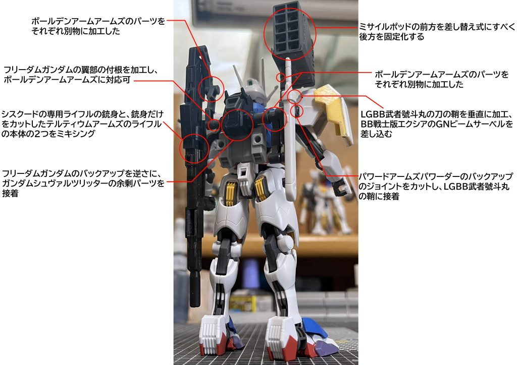 ミサイルポッドはHGBC「ボールデンアームアームズ(以下BAA)」のものを使用。当初は「鉄血シリーズ」の連装ミサイルランチャーを使う予定でしたが、「水星の魔女」を見て、決闘用MSコンテナがBAAのミサイルポッドに似ていたので、即座に使用を決めました。