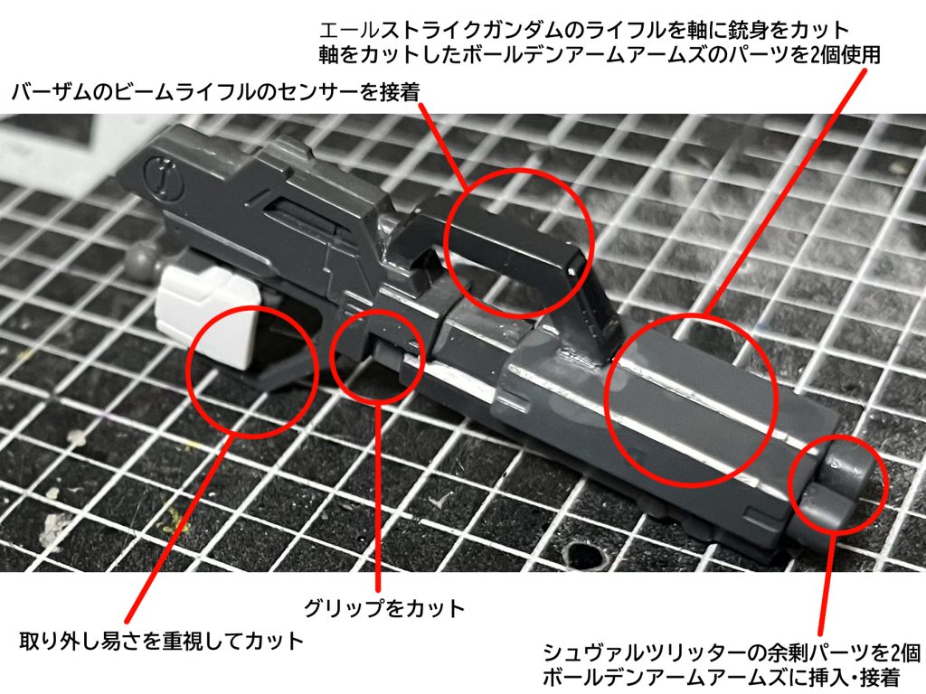 HG「エールストライクガンダム」のビームライフルをベースにミキシングで製作。HGBC「ボールデンアームアームズ」のパーツとHG「バーザム」のビームライフルのセンサーパーツ他を使用しています。