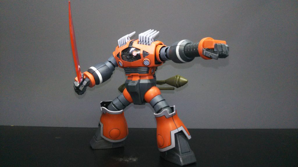 デカールは絞って腕のジオンエンブレムのみです。実は元ネタとして昔のアニメ「ポパイ」が影響しています。