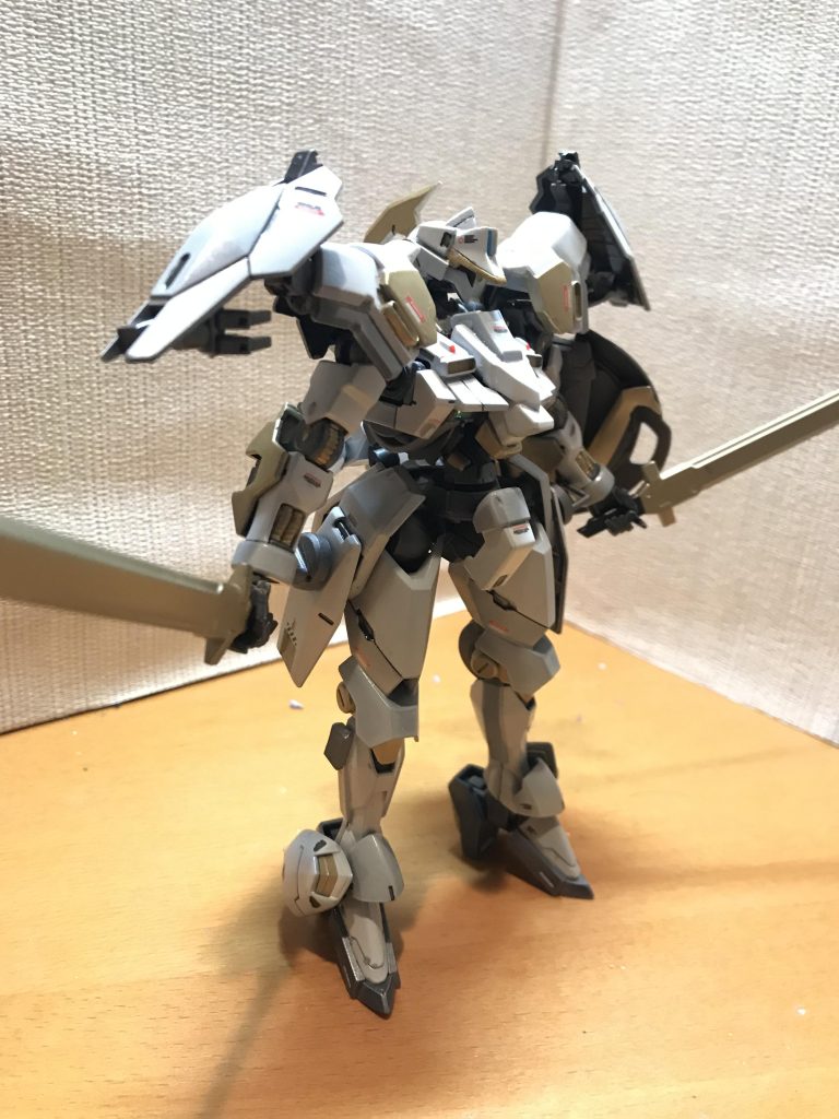 両肩のアーマー型のサブアームはアンカー射出が可能。阿頼耶識にてコントロールが可能。更に高電圧を放出する機能を備えている。