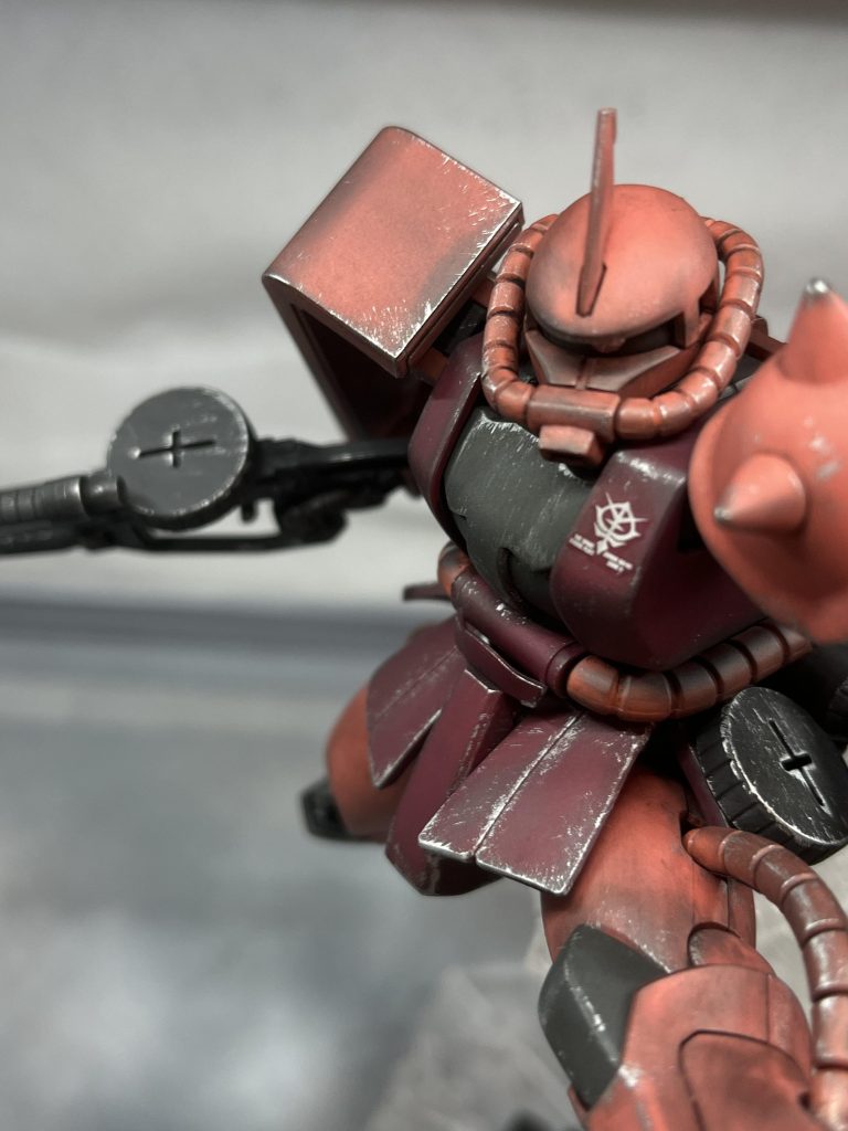 これはとても好みのウェザリングです。質感も然ることながら、金属擦れ、熱焼けなど丁寧に仕上げられていて素晴らしいです。格好いいシャアザクです。