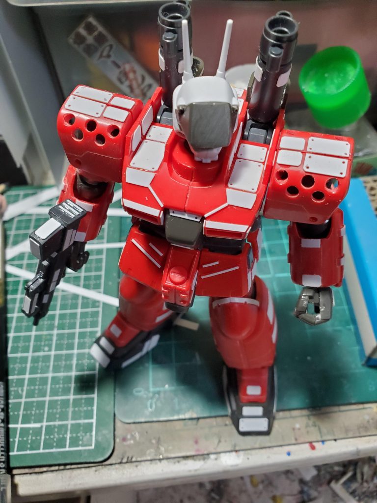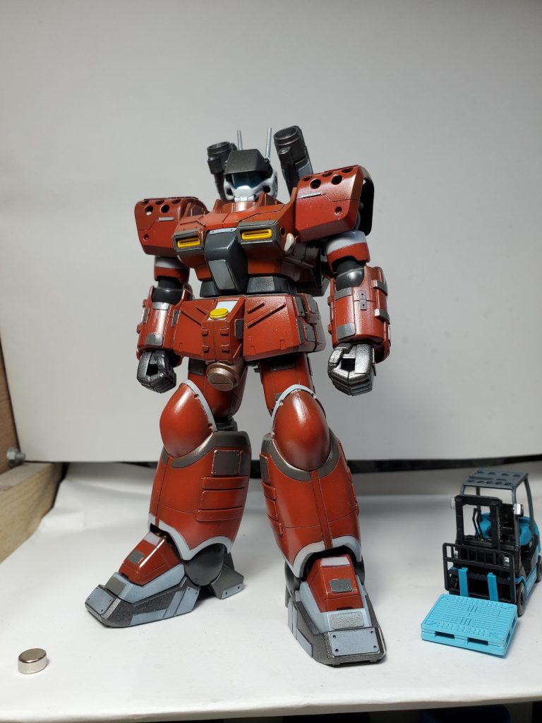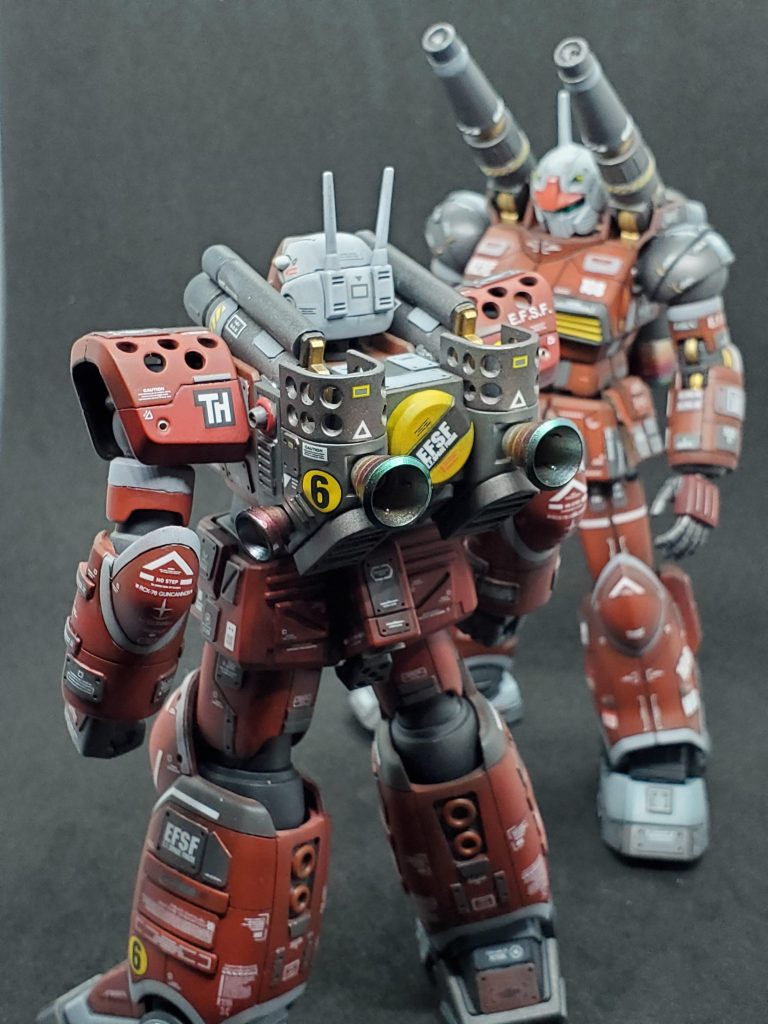 もはや量産機の情報量ではないですね!前回のガンキャノンと同じ渋めの赤、同じ差し色、このレベルの機体が二体並ぶと圧巻です。背中側のキャノンの付け根の金属質な部分がとても格好良く、素晴らしいです。