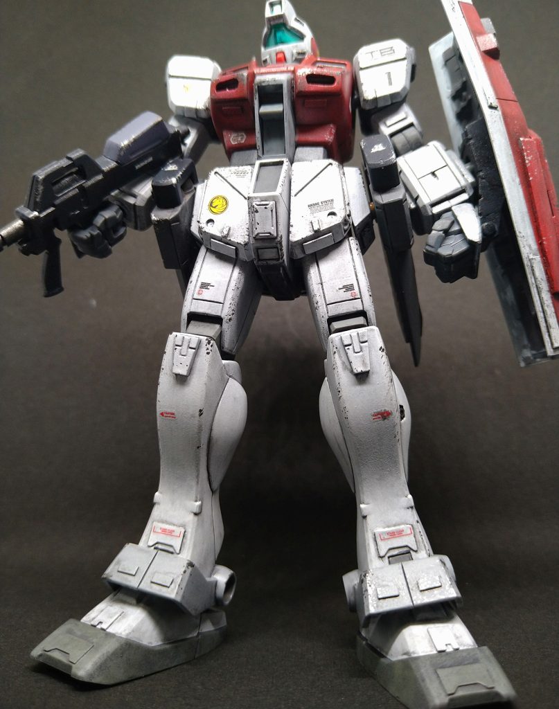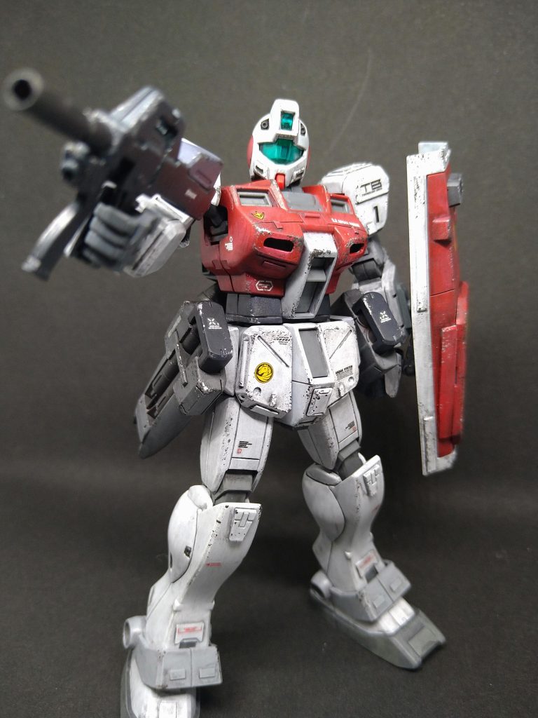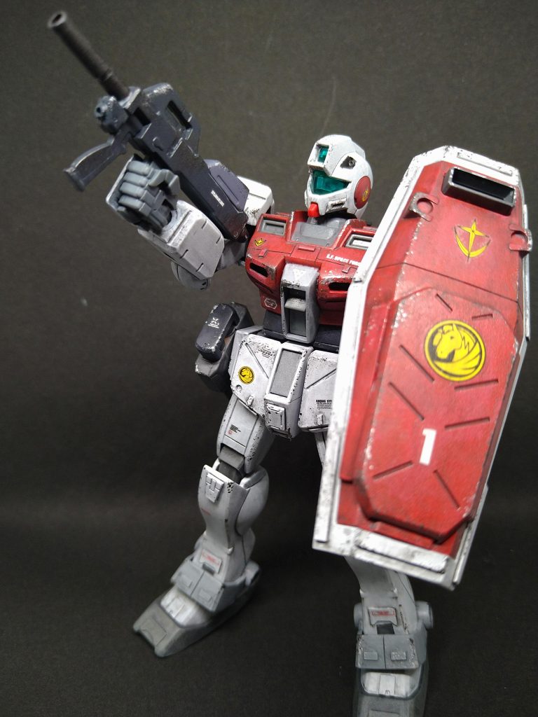 今回はif設定で、旗艦サラブレッドの直衛隊機とし、シールドは「HGUCジム」のものにディテールパーツとプラ版を追加。堅腰部には「HGジムⅢビームマスター」で余ったミサイルポッドを3ミリ穴で接続。