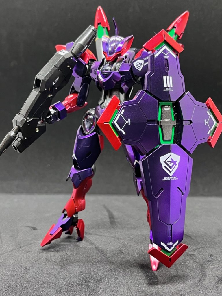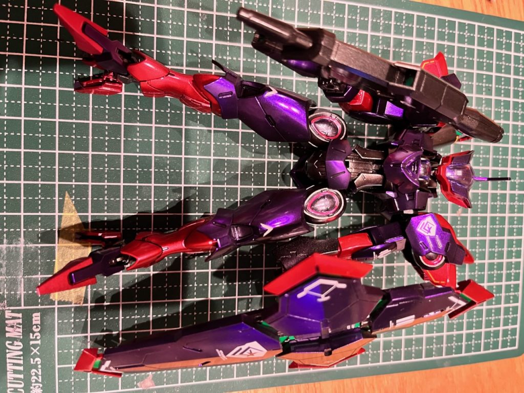 今回はテカテカな塗装で仕上げました。パープル部は黒下地のアメジストパープル、赤はシルバー下地にクリアルージュ、フレーム部はスターブライトアイアン。蛍光塗料でビコーンも可能。