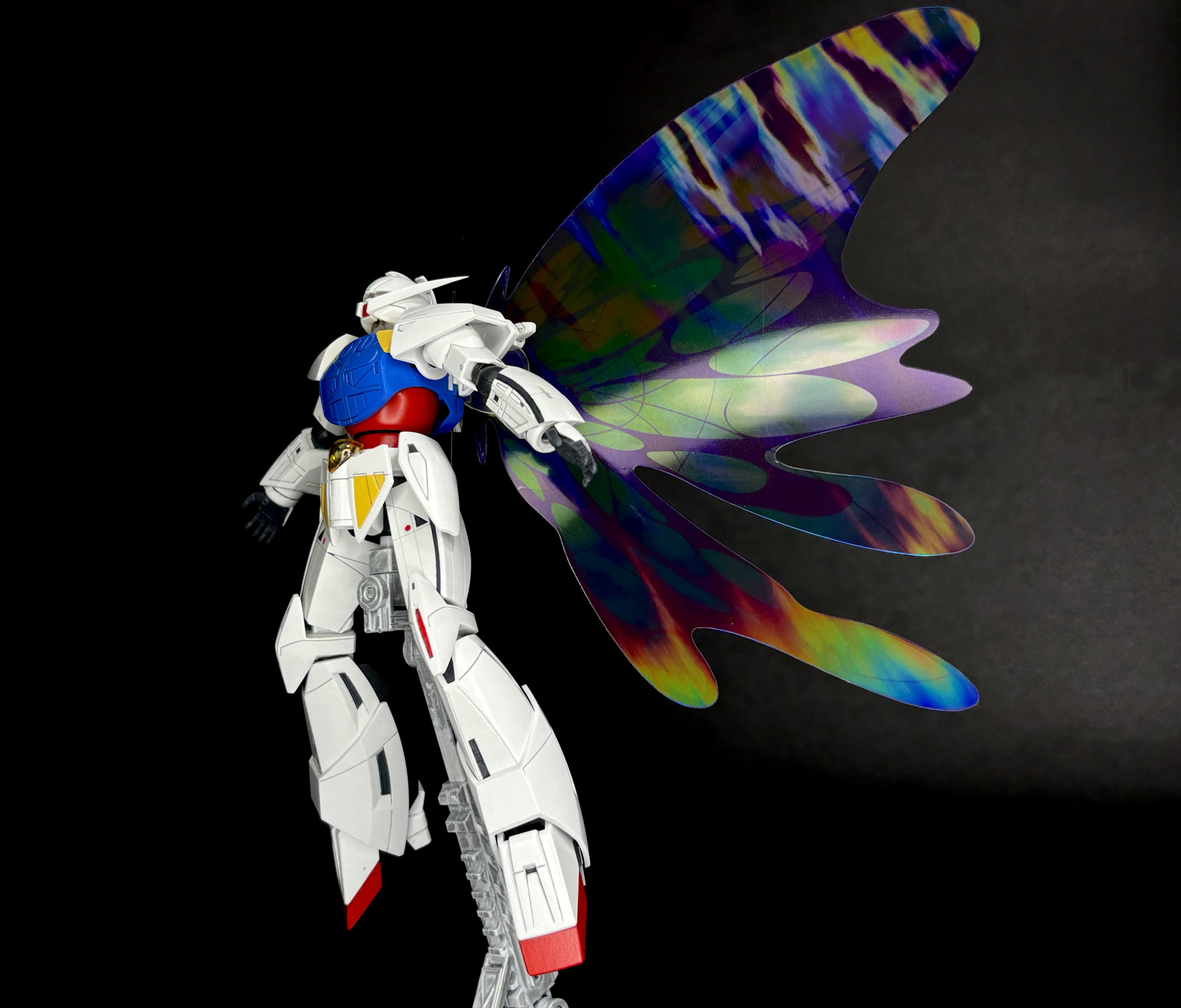 まずは全身のフォルムから。カラーリングはガンダム伝統のトリコロールカラーながらも、平面と曲面の独特な構成が∀以外の何者でもないシルエットを生み出しています。