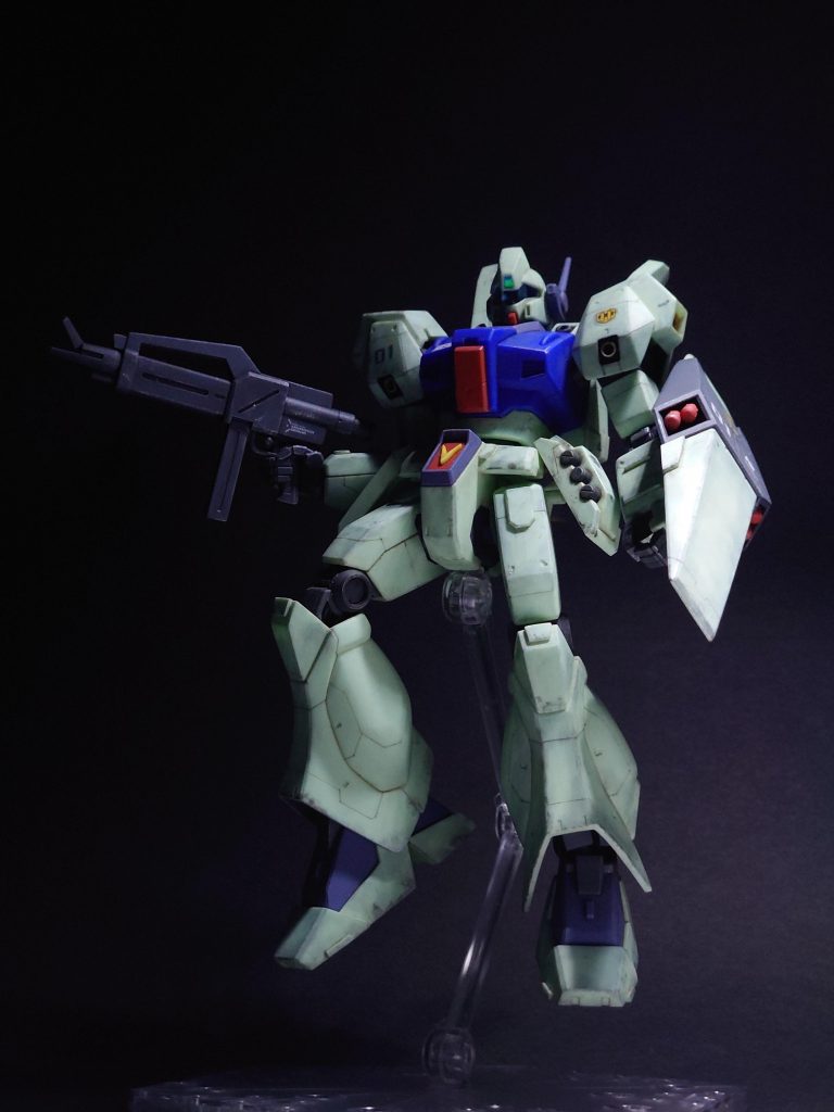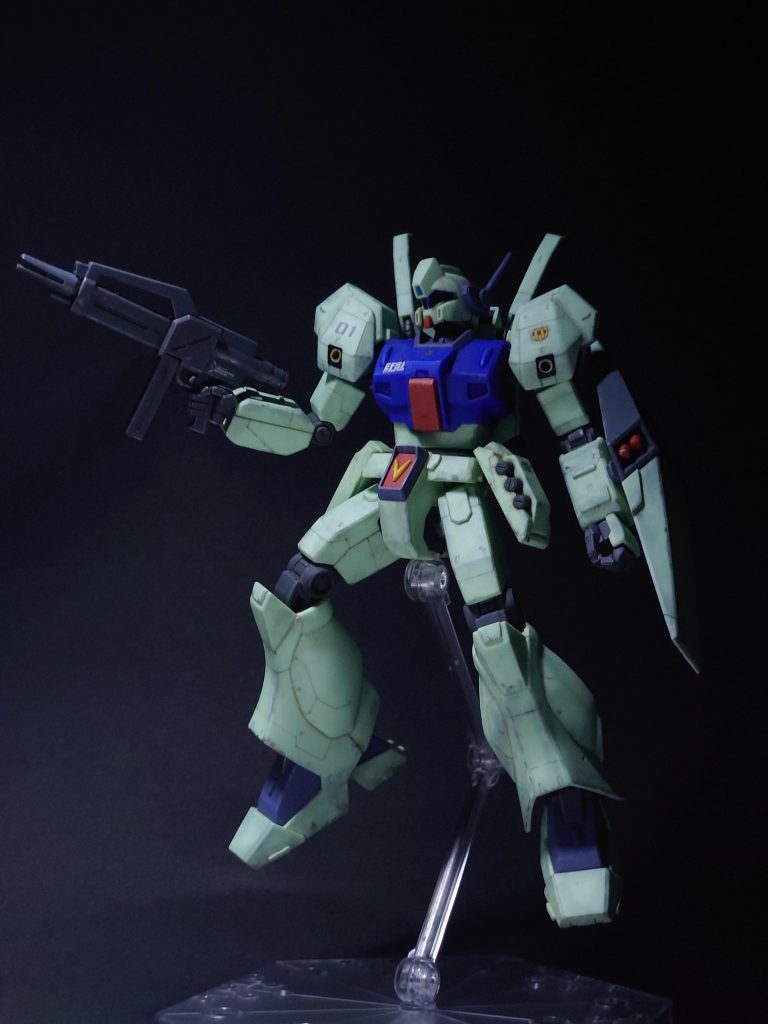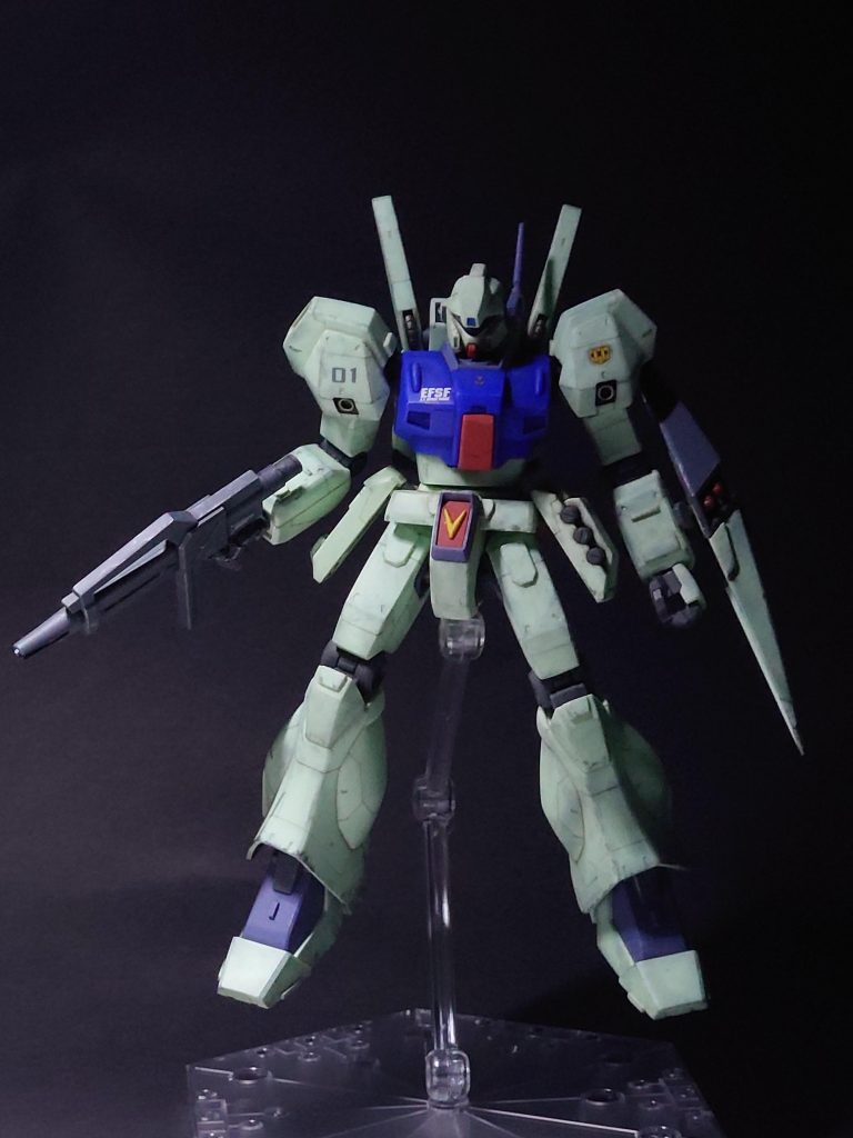 人気の無い機体ですが、サイドFでサンプルを見たときに「いうほどかっこ悪くないんじゃないか」と思いました。パッと見の悪さの原因は腹部の色分け、青とジェガングリーンが鮮やかすぎるからと考え、カラーをウェザリングで馴染ませるのを試みてみました。