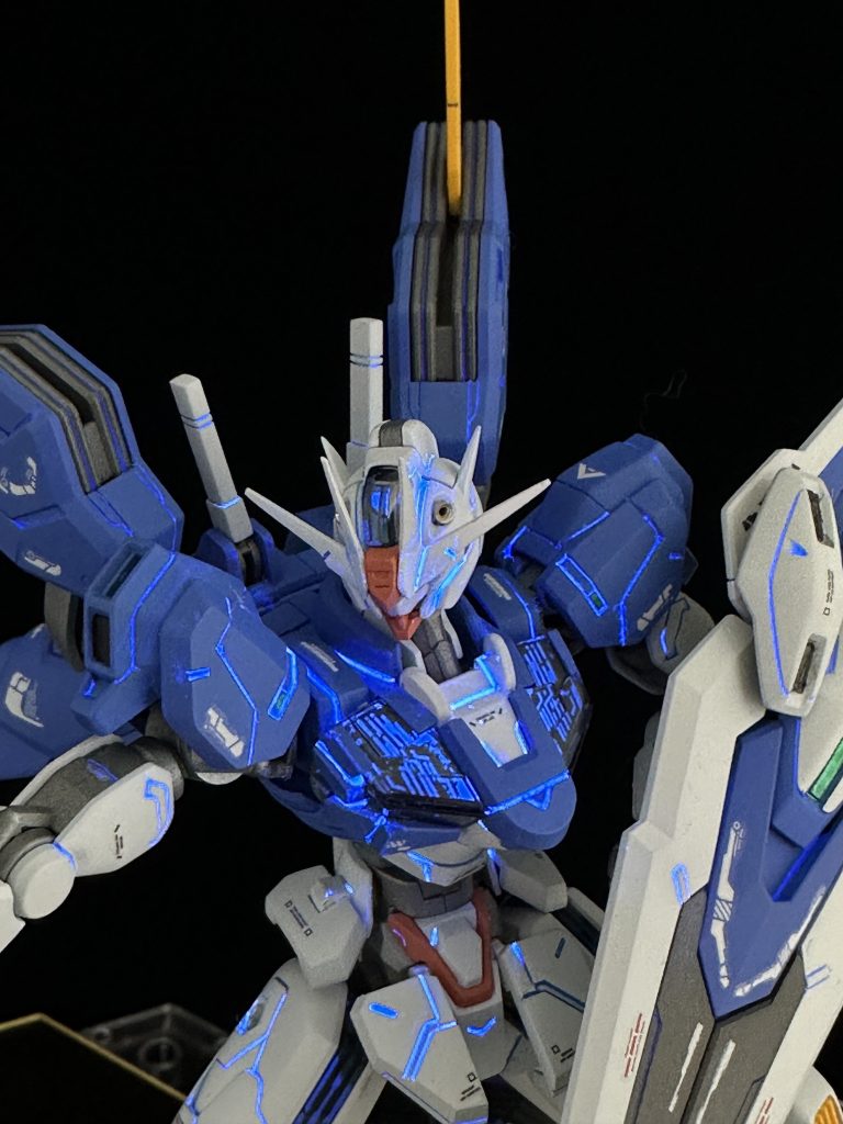 パーメットスコア:6を再現するために、シェルユニット内部に手を加えています。知り合いが制作していたエアリアルも同様にシェルユニットのラインが青くなっていたので、方法を聞くとホイルシールをスキャンしラインを透過処理したものを利用したデカールを使用しているとのことだったのでデータをもらえるか聞いたら快諾してもらえたのでそちらを使用しています。ラインが透過しているのでデカールの下をメタリックブルー+蛍光ブルーで塗装して再現しました。太ももも同じ要領です。さらに全身のモールドを彫り直し、蛍光ブルーで墨入れ。UVライトを当てることで発光を再現しました。