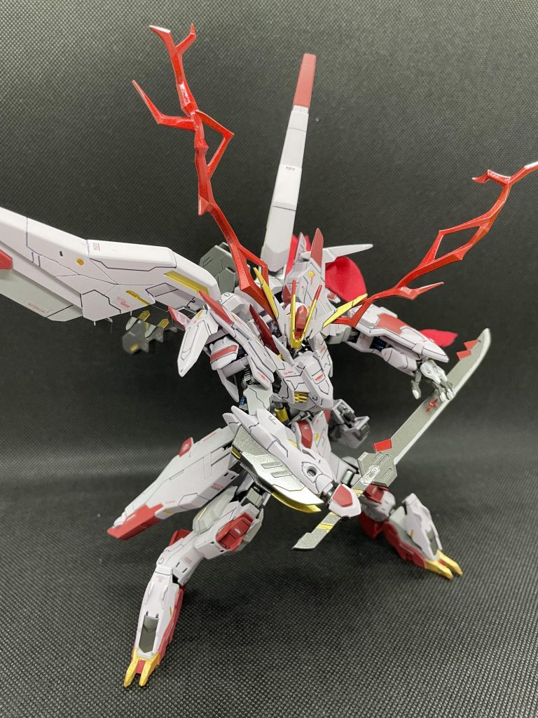改修ポイントは首、腰、脚の付け根部分の延長と足部爪の改修、ウイングバインダーの取付を逆に取り付けて位置を上昇させ、ブレードアンテナをvの字に跳ね上げてます