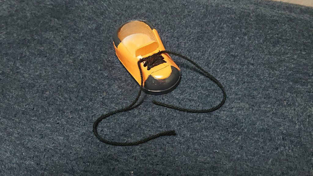 運動靴のヒモは、ちょいと太めの糸で本物の靴みたいに結びました。