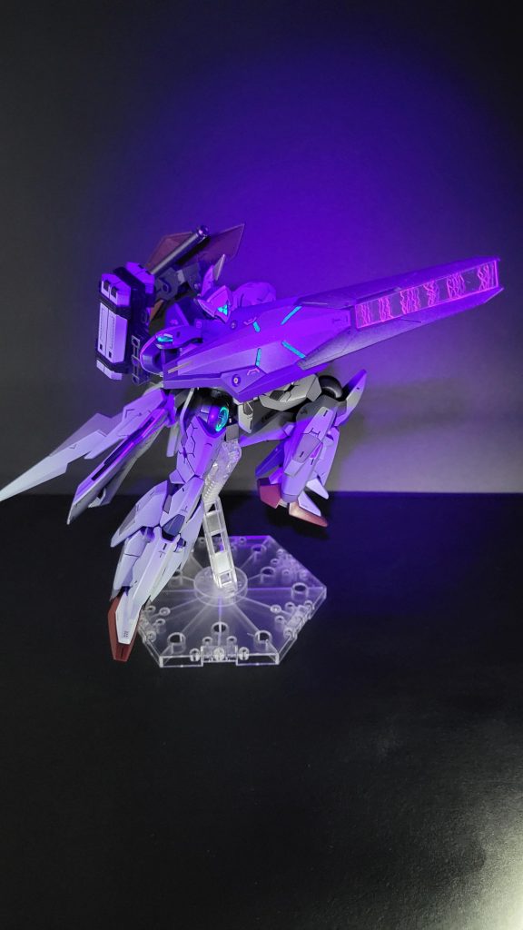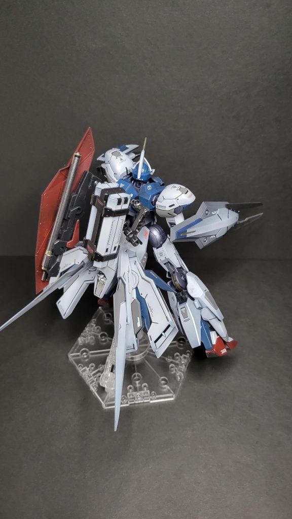腰部に大型スラスターを増設してるので、格闘戦の邪魔になる干渉を防ぎつつ高起動化を実現。