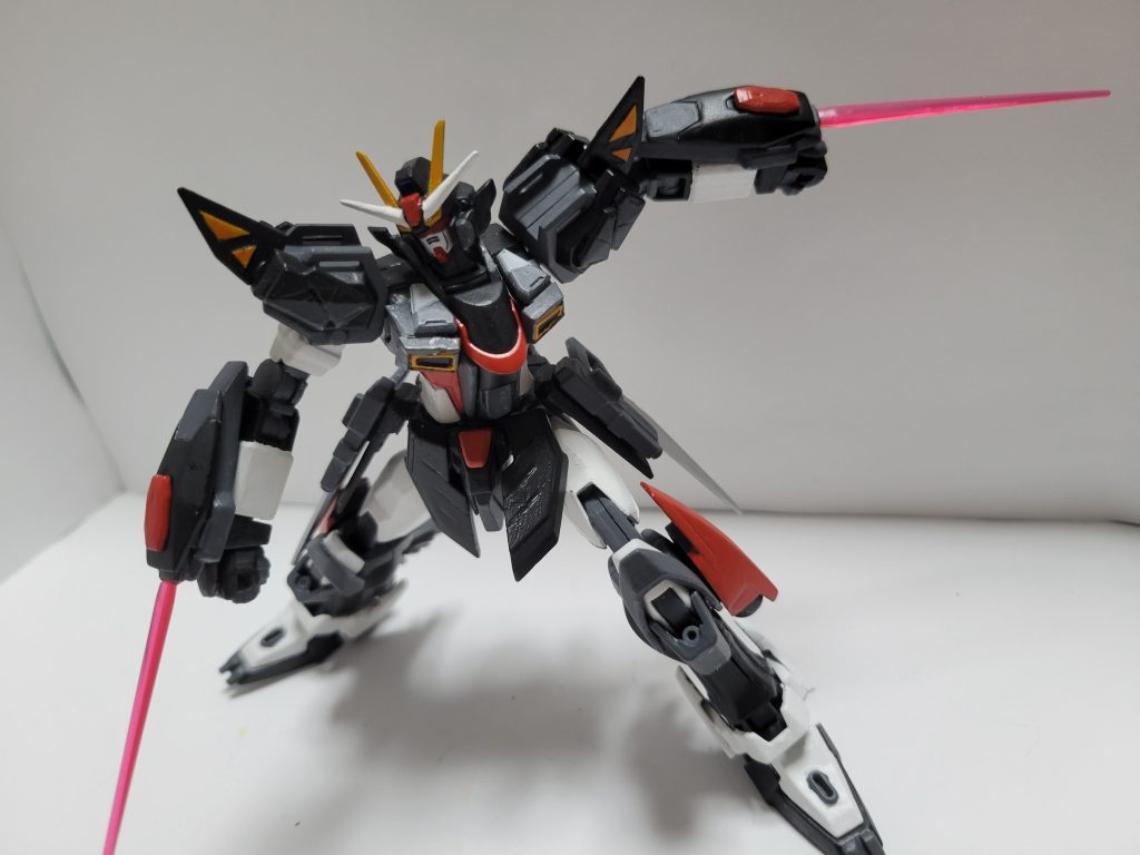 元のストライクノワールじたいにも言えましたが、ビームハンドガンに刃を付けたものがクナイのようで、ますます忍者のような感じになりましたね。ブリッツみたいなステルス機能が付いたらフリーダムなどの上位機体でもヤバそうです。(ガンプラバトルの範囲では)