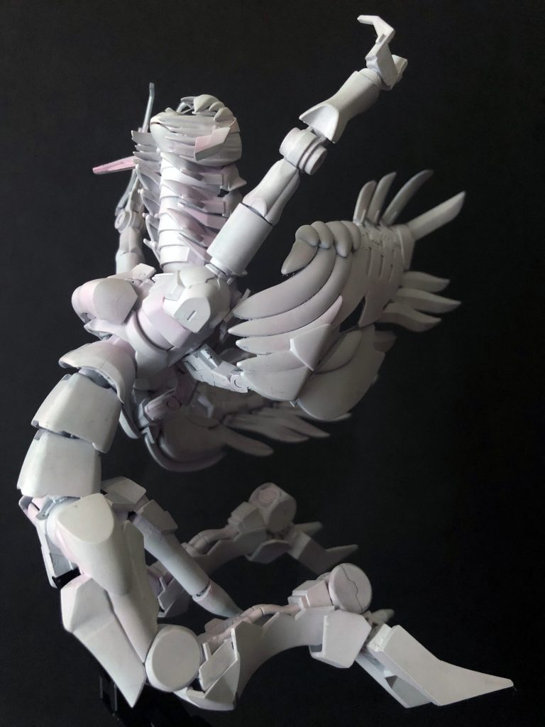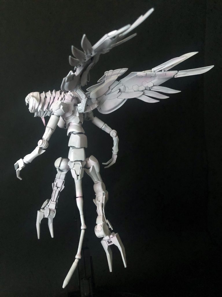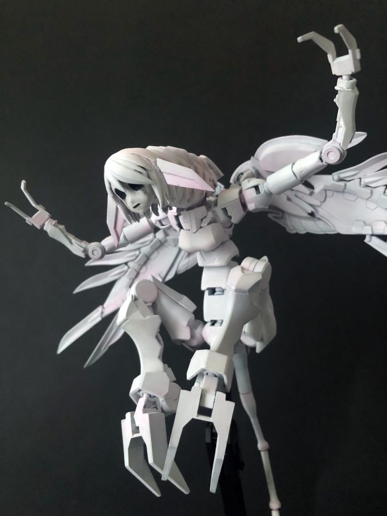 塗装は、エボブラックで下地色を均一に。その上でフラットホワイトを吹いて真っ白にしています。そして更にクリアーピンクと墨入れ塗料でウェザリングですね。