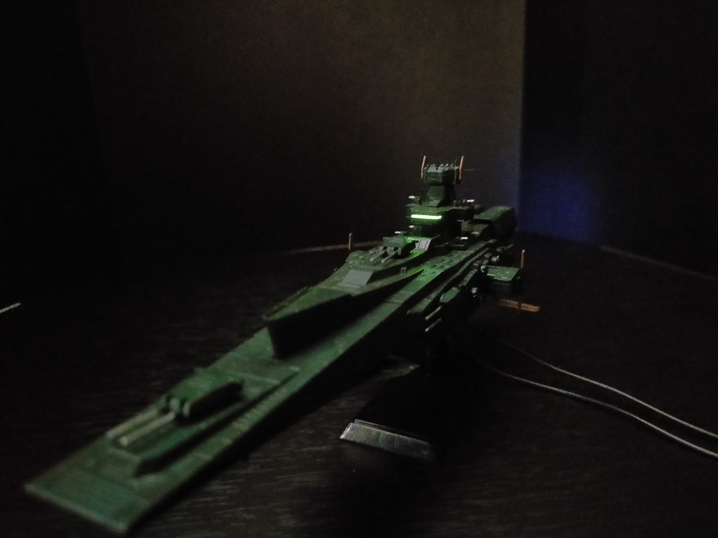 前作サラミスは砲弾型LEDにて光源を取りましたが、今回はテープ型LEDを採用しました。テープ型LEDの最大の利点として、砲弾型よりも小さい為、艦橋部まで光源を引く事が出来ました。全部で5つを直列で繋いだ物