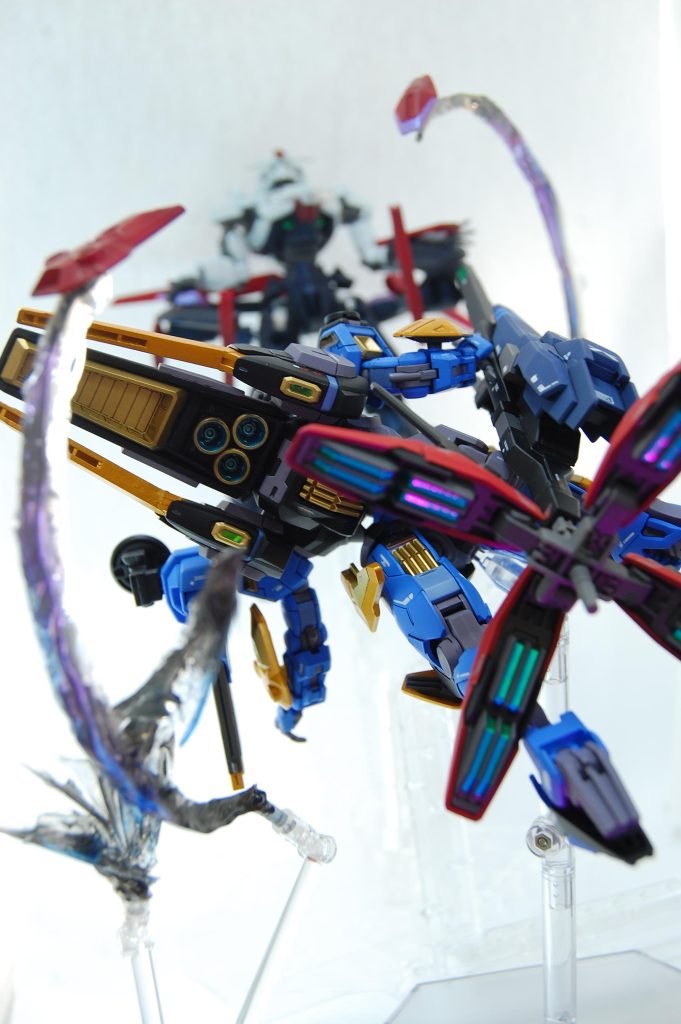 が、早々にやられるキャプテン。エフェクトはビームサーベル刃や30MMの爆発エフェクトを前ボケさせて撮影したものです。黒いビットエフェクトは前回のエアリアルの時にUVレジンで作成したもの。