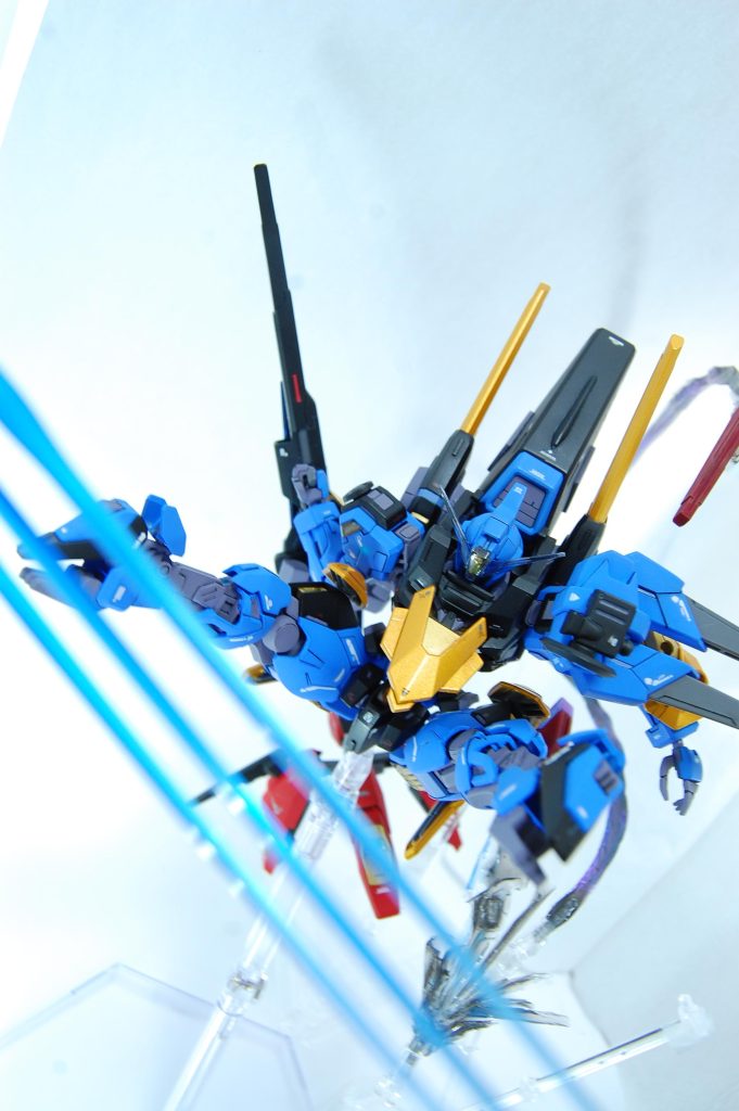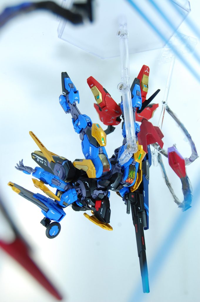 本体色はMrカラーのセミグロスブラックとMSライトブルー、赤がスーパーイタリアンレッド、フレームなどがHJVパープルグレー、金色が黒下地にブルーゴールド、青色部分の差し色に水性ホビーのすみれ色。ロッドライフルはティターンズブルー2と水性ホビーのエアリアルグレーで、本体とは配色パターンを若干違うものにしました。