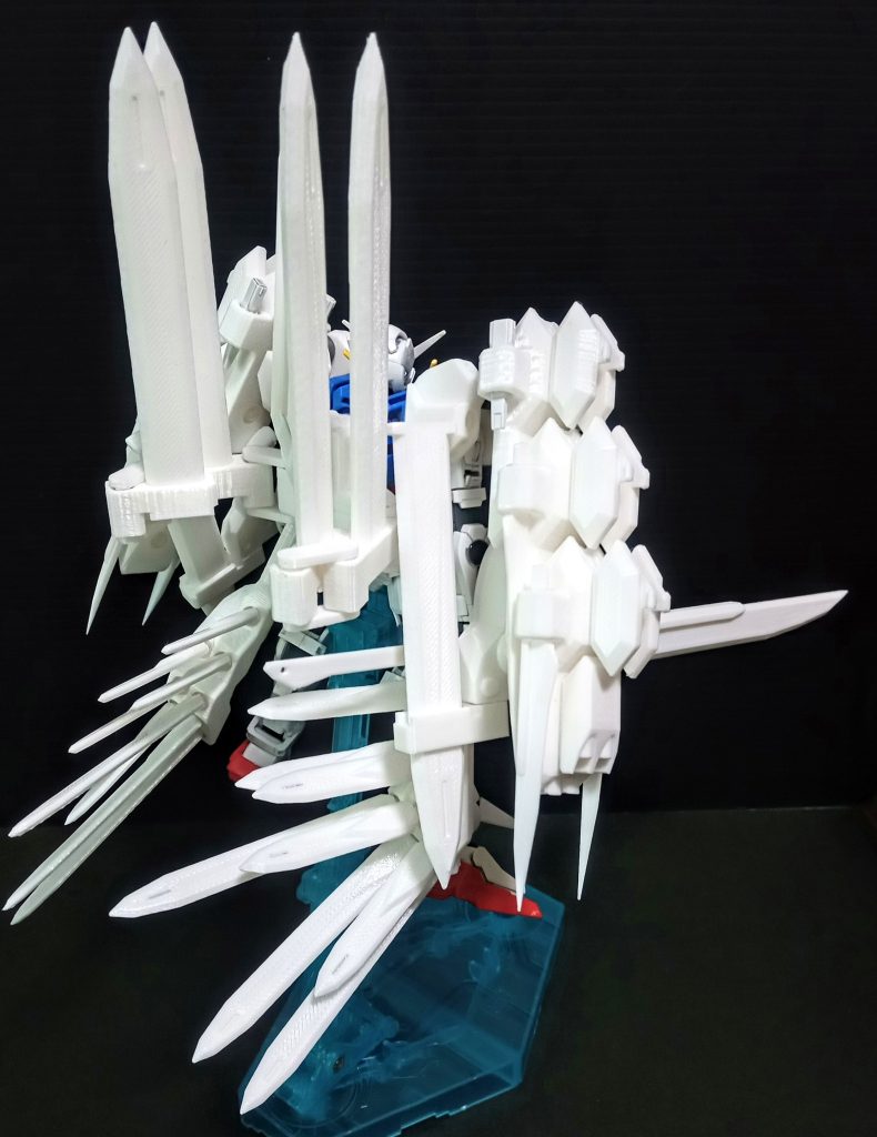 メイン武装のGNソードが両腕に2本と、背中に予備が4本 GNソードは刃を打ち出す事も出来る為、予備があります。