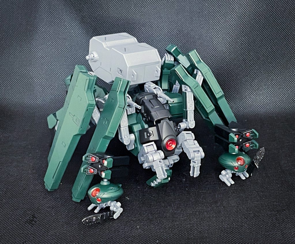 MS形態で、腰のサブアーム、大型コンテナ、そして盾兼コンテナビットという装備がそれぞれ役割をもちながらそれぞれクモ型MA形態の造形に役立っていて、どちらかの形態で遊ぶ装備が出ない変形機構としてのまとまり方も大好きです☺️