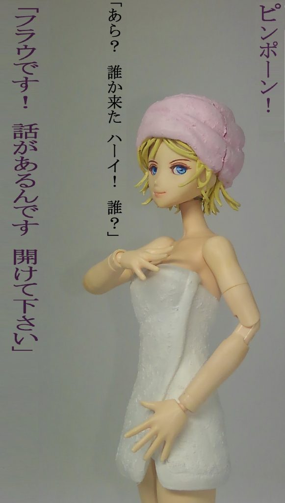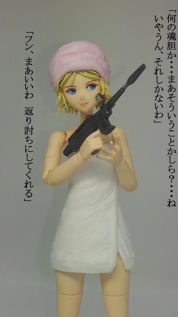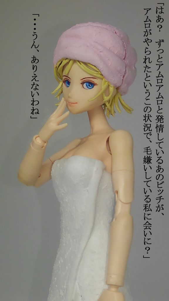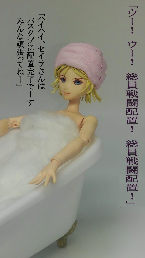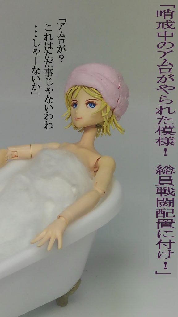 セイラさんの入浴シーンは映画版テレビ版共に日本的な湯舟に首まで浸かった状態、警報で湯舟を出てタオルで体を拭く仕草しかないのですよね。なので今回のバスタブに浸かった状態、タオルを巻いた状態は完全にアレンジになりますね。湯舟は再現が難しく、体を拭く仕草は刺激的すぎて無理w ゆえに今回はタオルを体に巻いた状態での作成となりました。