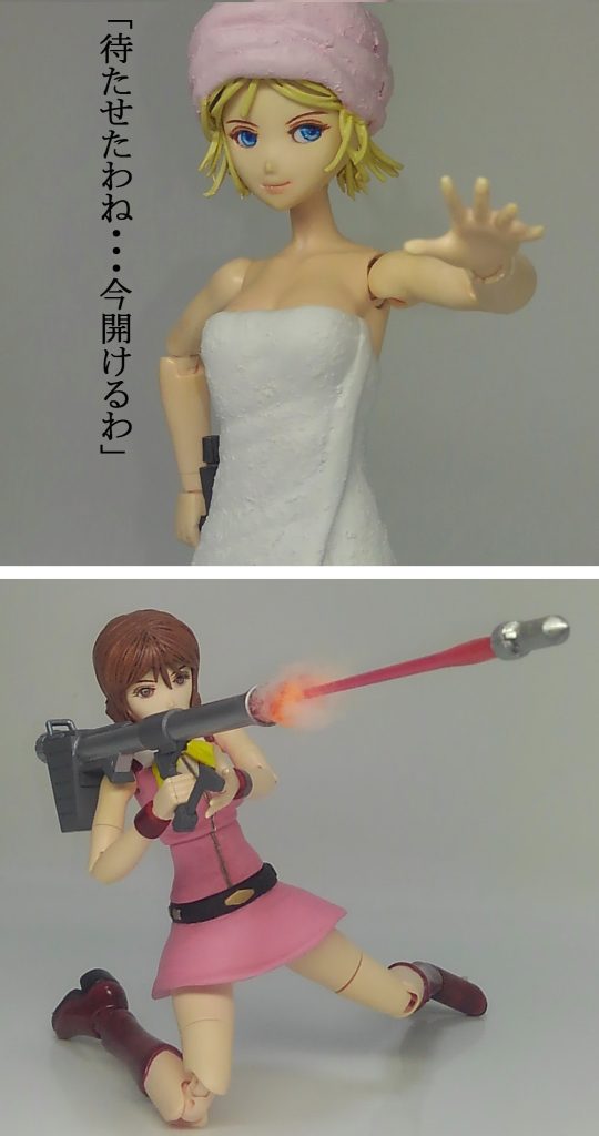 過去に作成したバズーカ発射エフェクトと弾が見つかったので、フラウのバズーカ発射シーンを再撮影し、写真を差し替えました。フラウはドアごとセイラだけを吹っ飛ばそうとバズーカを使いましたが、実際には爆風が自分をも襲い自爆となったという感じですw