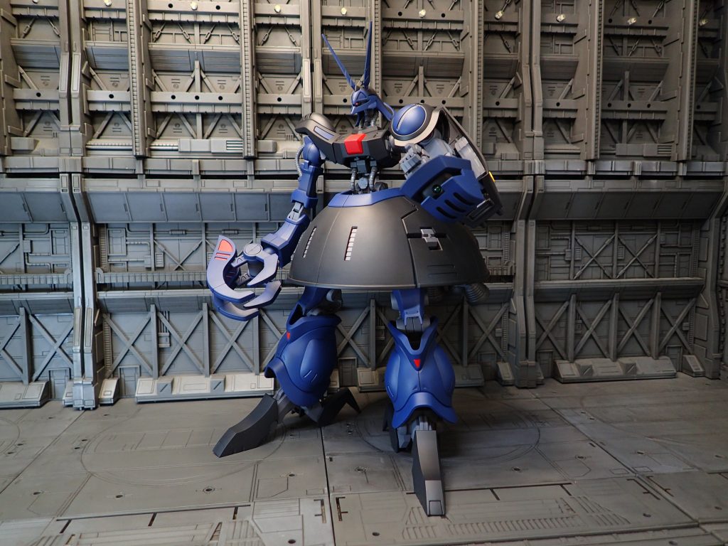 毎度の通りティターンズカラーにリペイントしています。バウンドドックは非常に大きいため、ショーケースにも何とか収まるという感じです。撮影もちょっと大変でした。動力パイプははじめVカラーで塗装していましたが、すぐに剥がれてしまったので、斎藤塗装の「ウレヒーロー」という塗料で塗装し直しました。