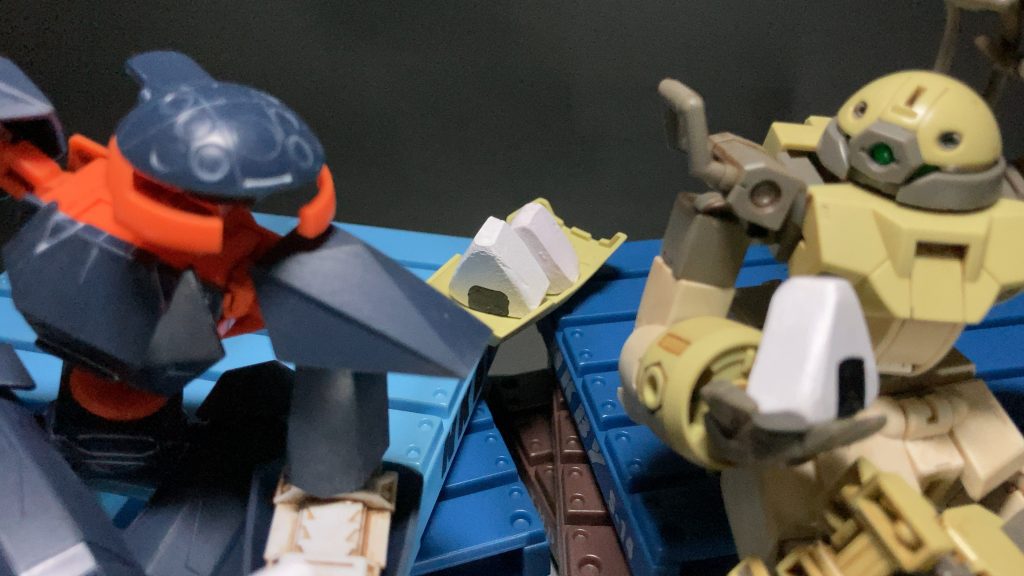 モビルスーツはおにぎりなど食べませんが、穏やかな雰囲気が演出できればそれで良いと思いました。♨️