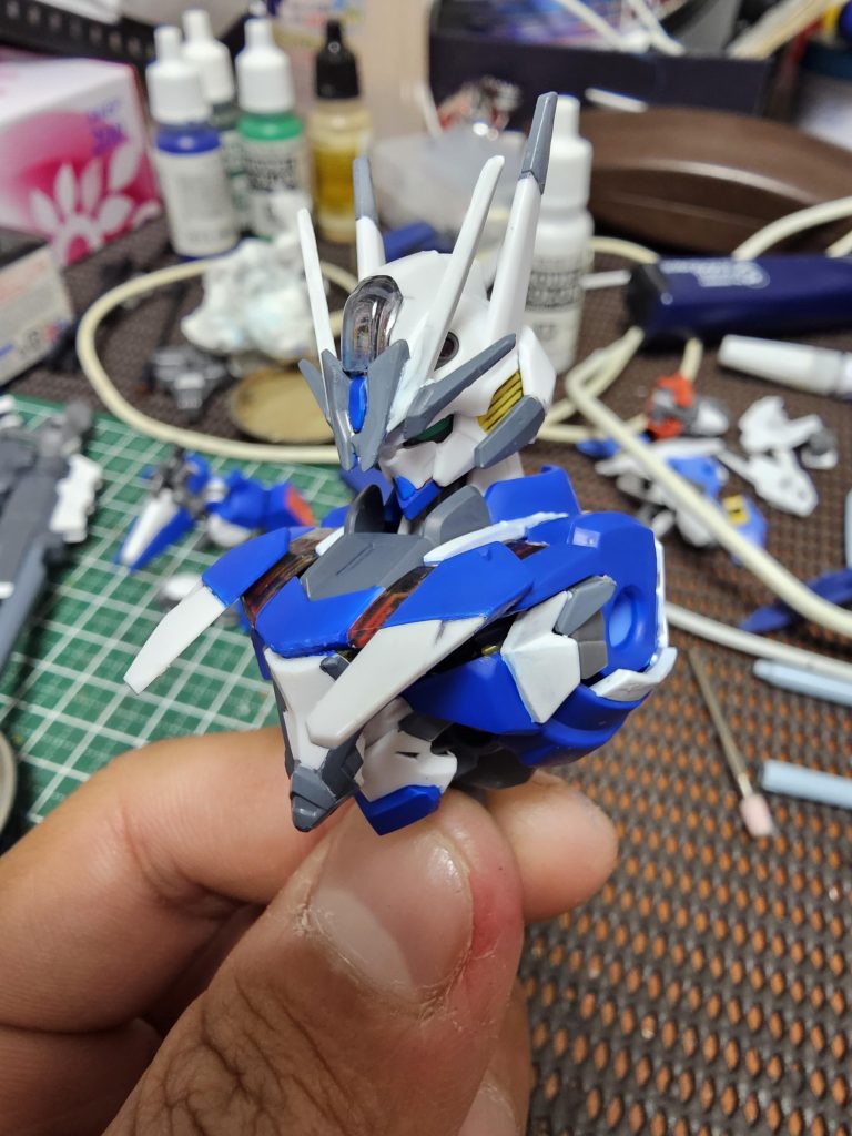 頭部はウイングガンダム炎のブレードアンテナを使用しています。あとはすべてエアリアルのパーツを切り貼りして製作しています。