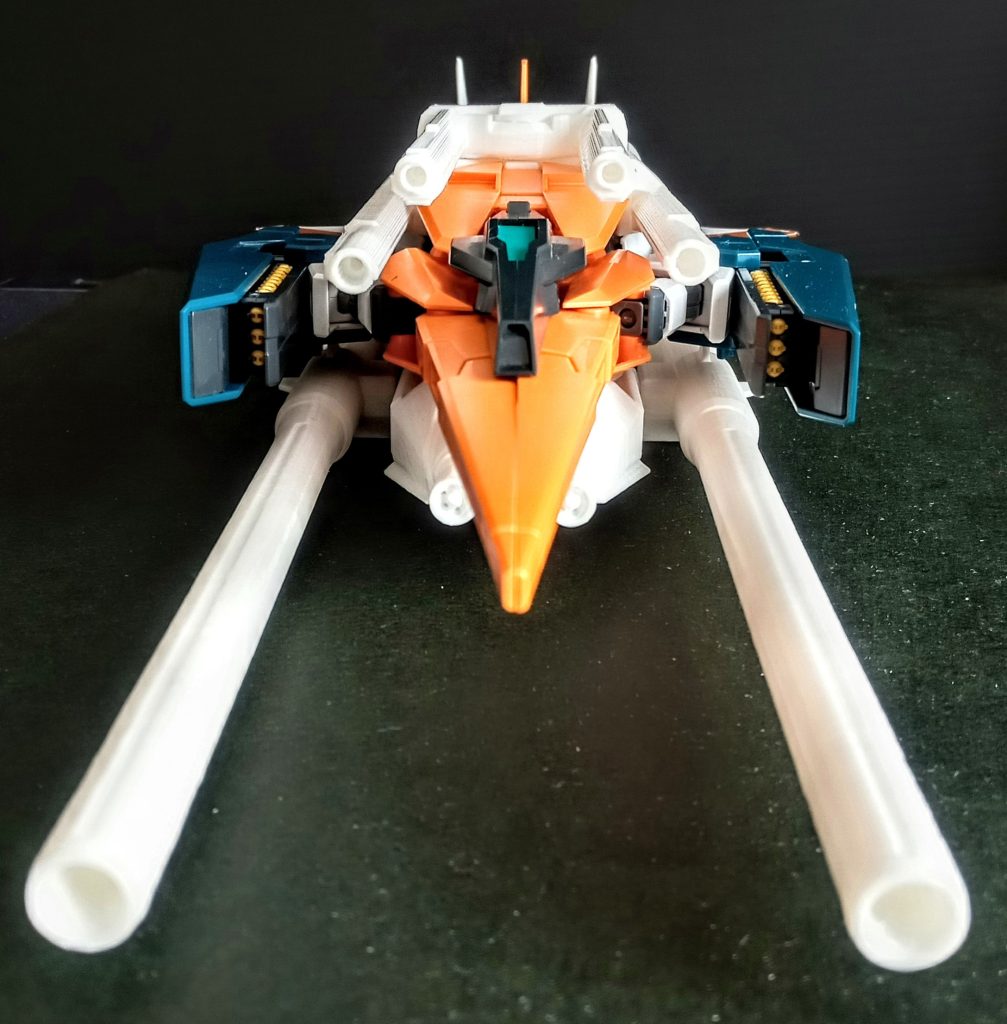 敵母艦の射程範囲外から、2門のバスターランチャーで先制攻撃。撃ち洩らした場合は、一番上の回転式のGNキャノン、その下のGNランチャー、下面のGNガトリング、そして、両腕とテールコンテナのマイクロミサイル300発でトドメを刺します。
