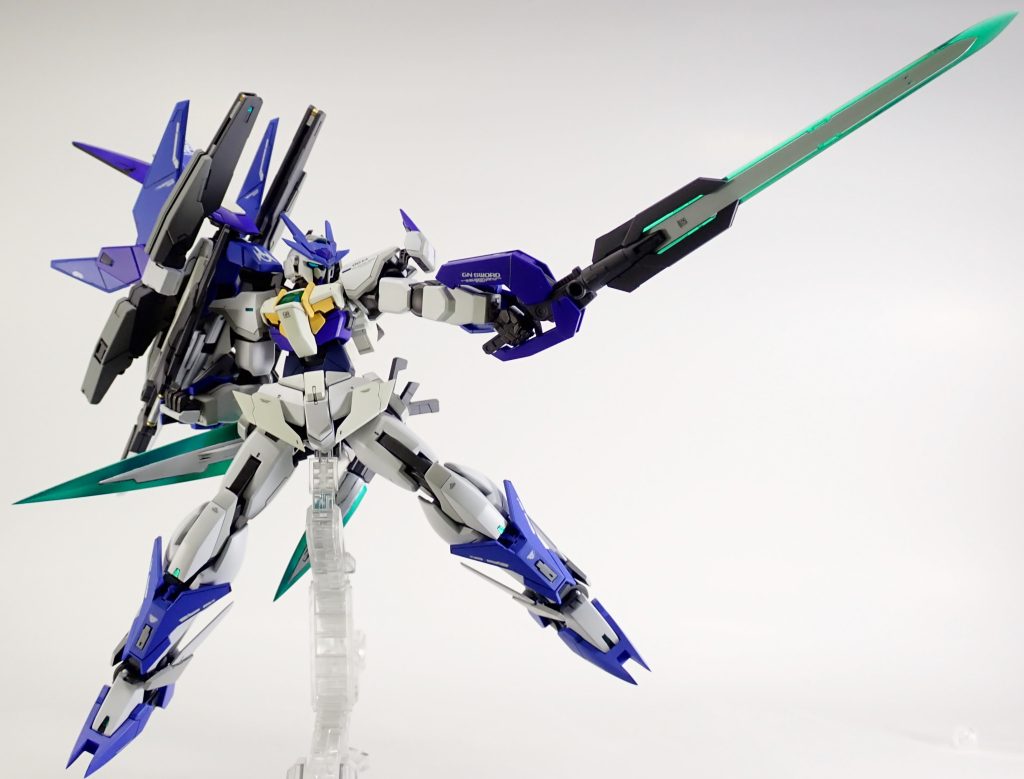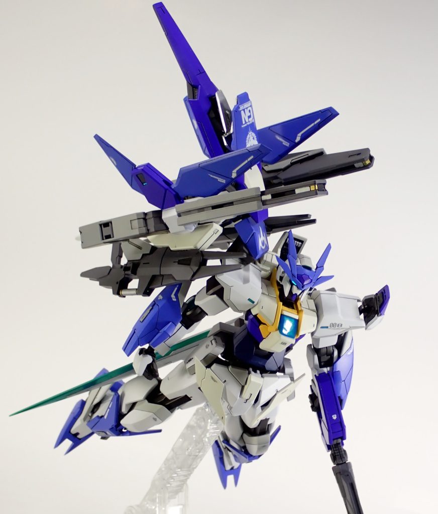 HGBD ダブルオースカイメビウスにRGクアンタとHGダブルオーセブンソードのパーツを組み込んで、00本編に出てきそうな機体を作ってみました。グラハムが乗ってそうな感じにしたかったので左利き仕様となっています。