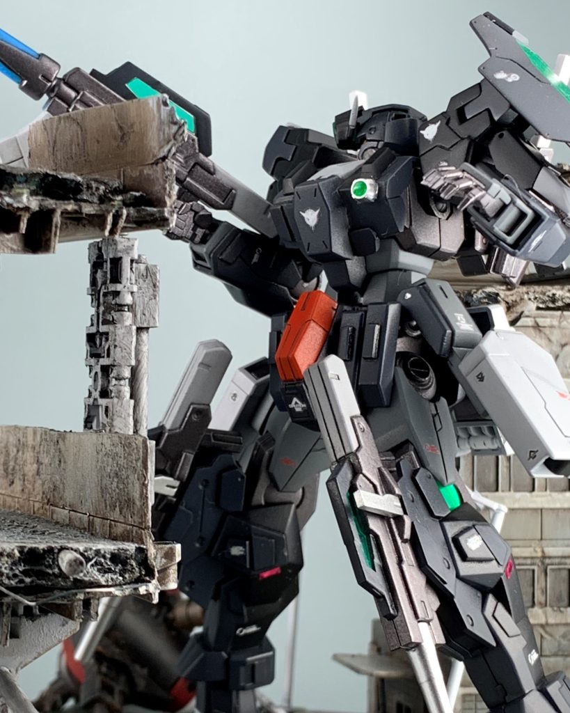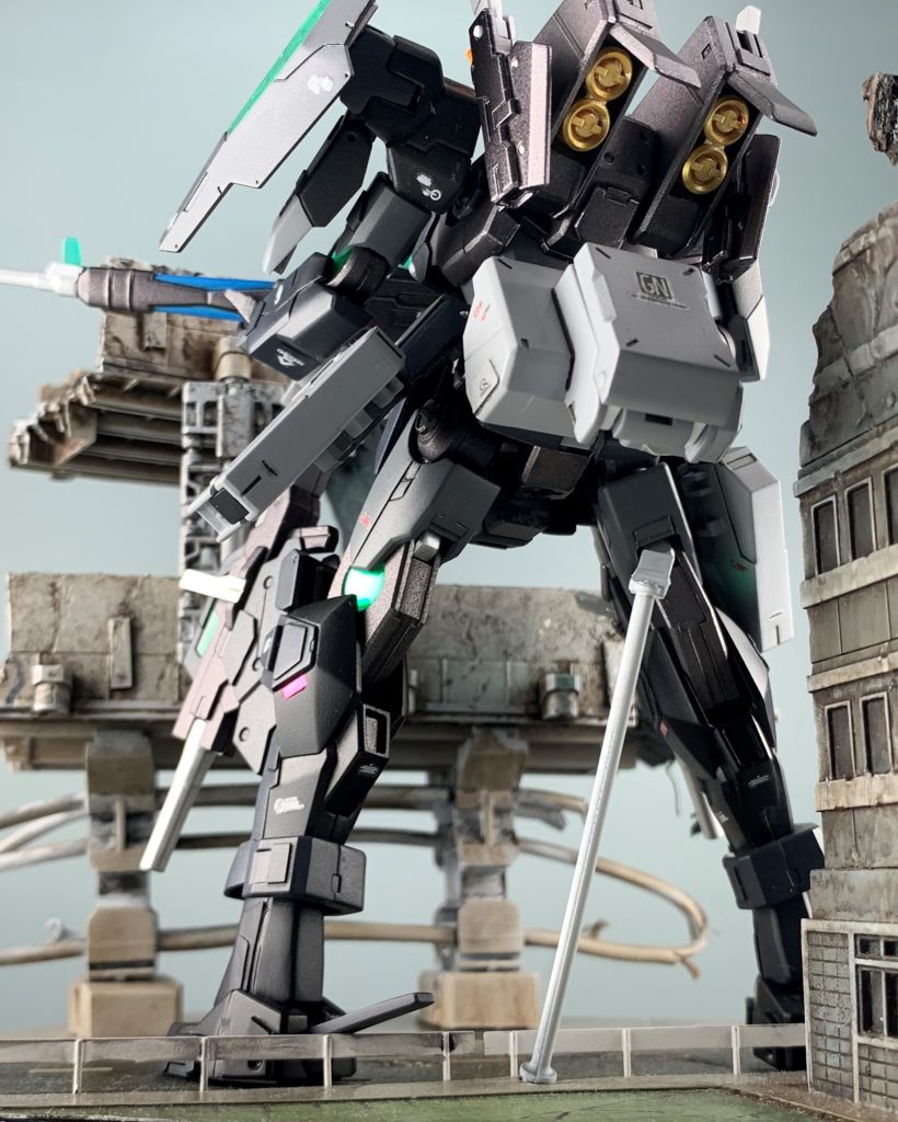 プラ板や掘り込みでディテールアップをしています。カラーリングは設定に近くなるように缶スプレーやガンダムマーカーを用いてグレーの5色を再現しています。