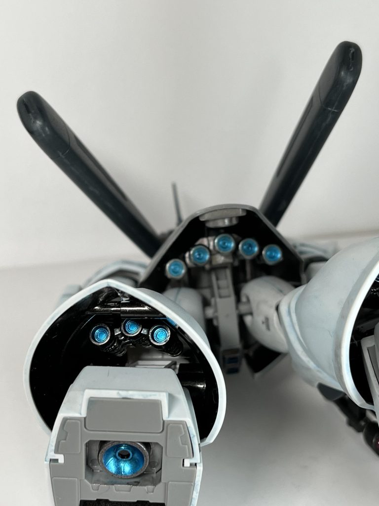 両肩前面のスラスター内部は、思いつきでガンダムマーカーゴールドで塗ってみたところ、引き締まった感じが出たのでお気に入りポイントです。