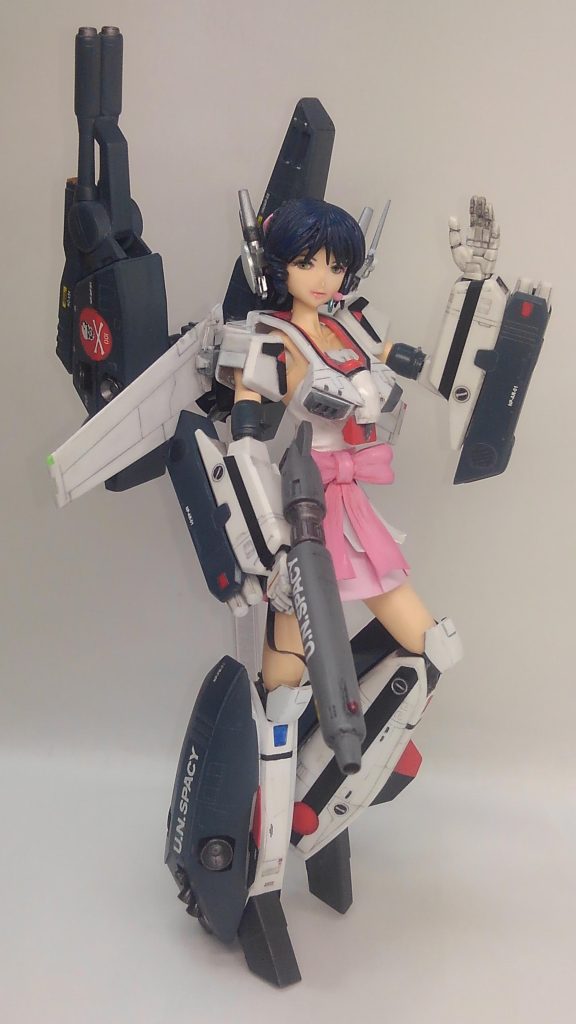 本当はアオシマさんのVFGシリーズの様にガウォークに乗せたかったのですが、見ての通りミンメイのサイズが大きすぎで乗せるのは厳しかったのでそこは諦めました。ただチャレンジした方がコミカルで面白かったかもですね。なんというかバルキリーが重くて潰れてるみたいな絵でも良かったかもw