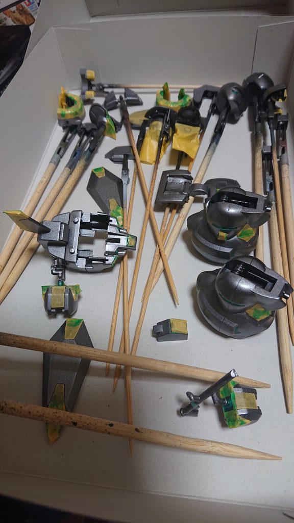 塗装は黒サフ後ライトガンメタルで全体を塗装しマスキングし
