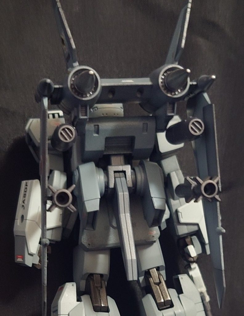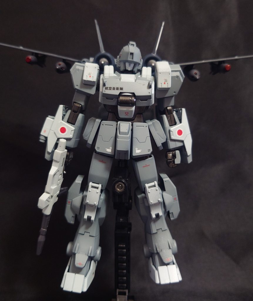 空自仕様にするのに飛べるMSしようと思い、何がいいかと考えたのですが、宇宙世紀で変形せずに自力飛行できるものだと、バイアランかグフフライトタイプくらい(ハサウェイ以降は別として)しか思いつかなかったのですが、SEED系のMSを見たときに「これだ!」と思いウィンダムのジェットパックの部分を使用してみました。