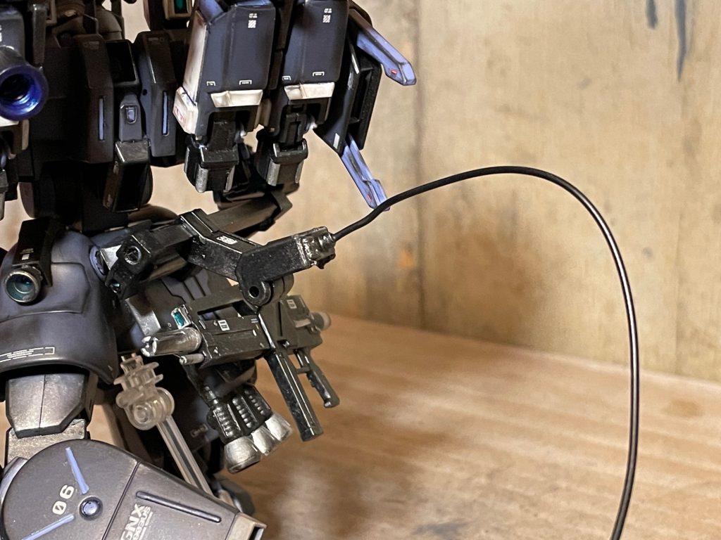 ユニコーンガンダム hgの腕(ジャンク品)の前腕部を延長(真鍮線&接着剤)。右腕の長さを合わせる。