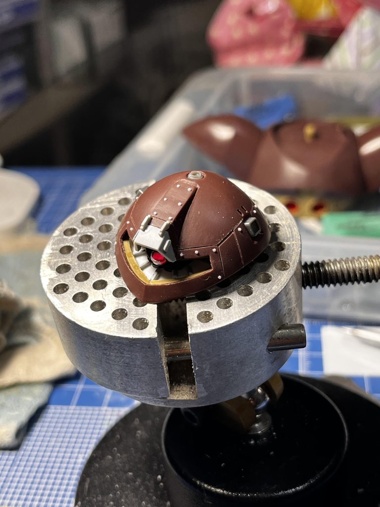 頭部→細かなディテールを追加、胴体にめり込むように加工、モノアイも可動するように作り替えました、横の動きしか出来ませんが。