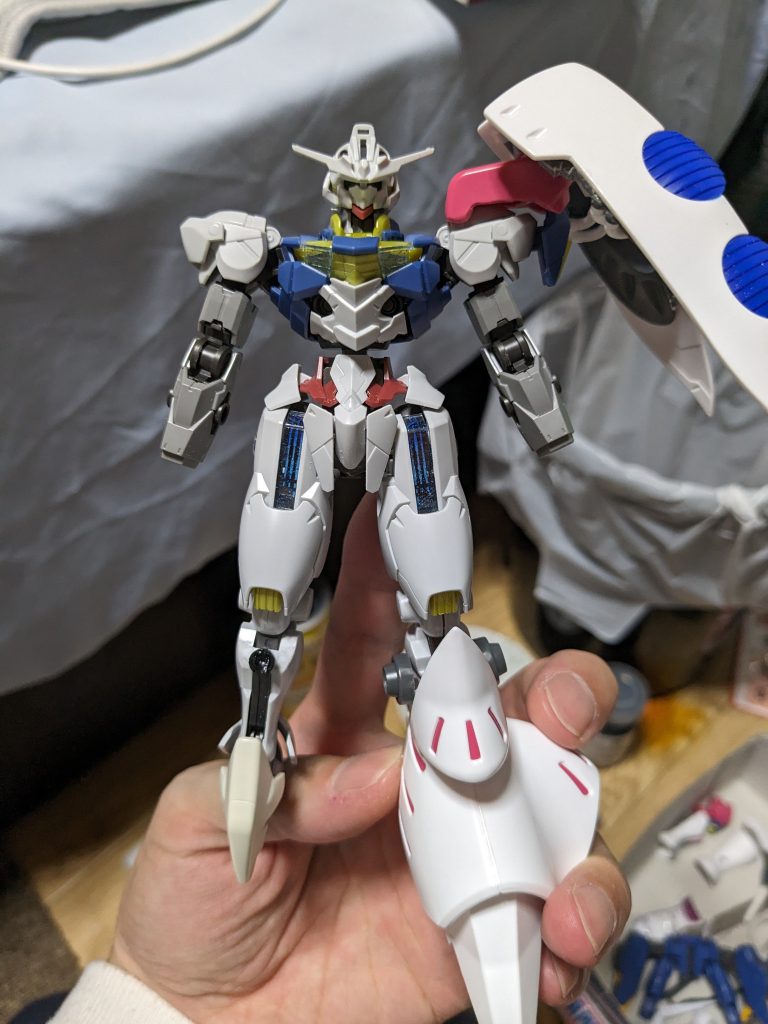 エアリアル改修型、母親、エリクトとの関係も良好だがスレッタ自身も何かしないとと無理しがちに…ミリオネからの相談もあり改修されたが過保護型といったのが、しっくりくる仕様に。合体時、簡易のデータストームを展開、他の機体に干渉は出来ず機動力は悪くなるが、エリクトたちの操作サポートが入りやすくなるので反射速度は上がる。その為、エスカッシャンを抜けても不意をつくのが難しい