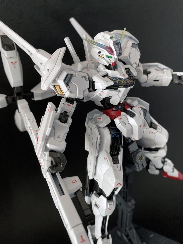 物語終盤に登場した水星MSですが、化け物やヤバイ奴と散々な言われようでしたが主人公搭乗の為かそこまで問題ある機体という感じはなく。むしろ、その白を基調としたモノトーンな佇まいに、ユニコーン的な良さを感じて購入&製作しました。水星用のデカールではなく余っていたRGνガンダム用などを全身に貼りました。バリアブルロッドライフル(箒)は合わせ目が消しきれなかった所を中心にプラ材等を追加してディテールとして誤魔化しましたが、情報量増えて良かったかも。後は胸の丸モールドに何か意味を持たせたくなり、メタルパーツを貼ってあります。足が細く上半身が重いと自立が難しくスタンドは必須になりました。