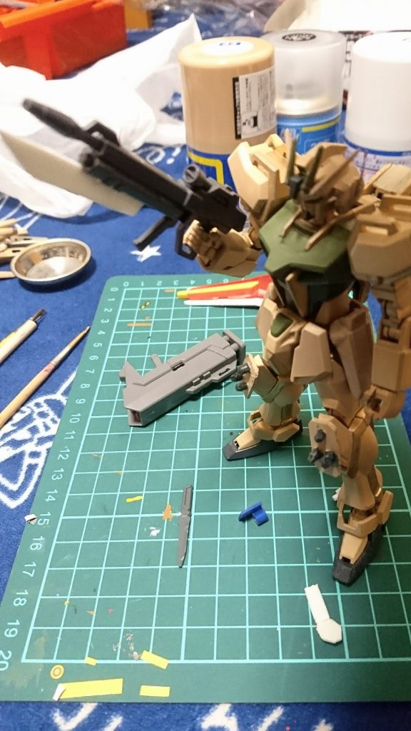 ビームライフルには近接戦闘にも対応できるよう、プラ板を加工して作ったブレードを新たに取り付けたので、ライフル兼ソードとして使えます!