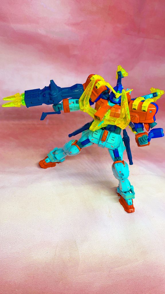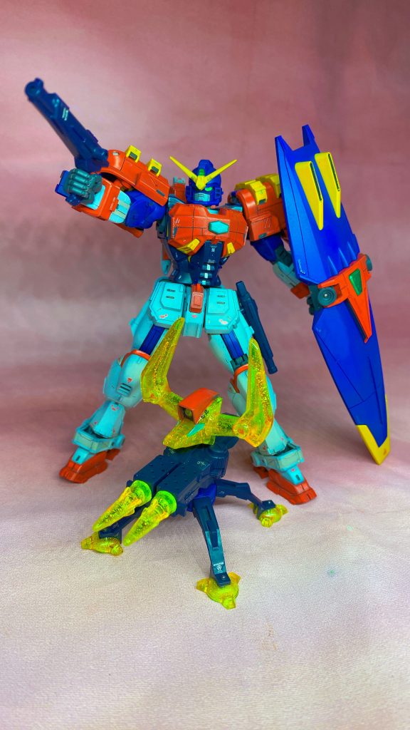 クリアは蛍光パールオレンジでスミ入れを行い、ツインアイはシルバーからパステルプリズムミントグリーンライトブルーで塗装しています。